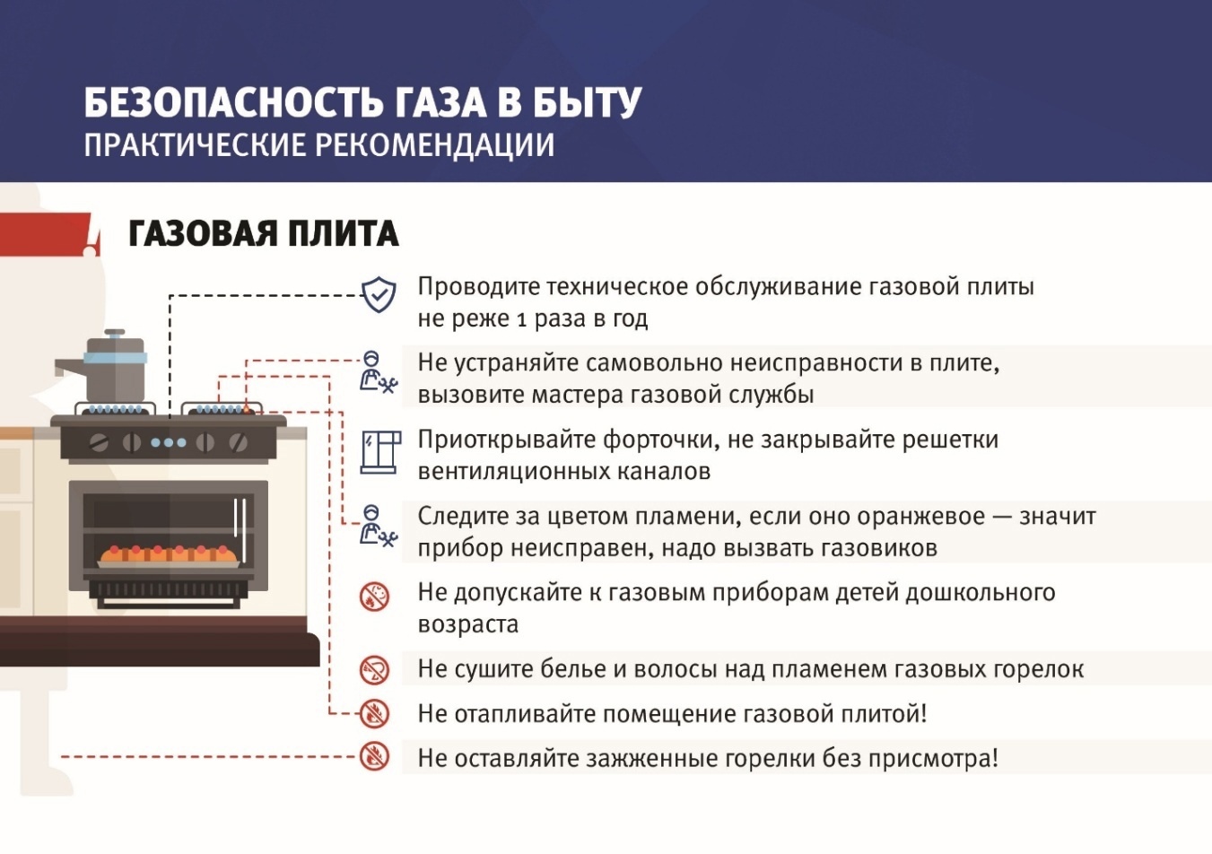 Не оставляйте без присмотра работающие газовые приборы, особенно - если доступ к ним имеют дети.