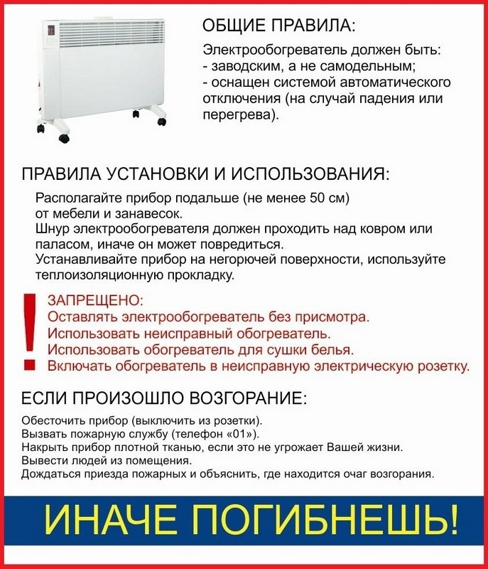 Обогреватель нужно устанавливать на огнестойкой подставке. Он должен быть исправным, не кустарного производства, желательно с системой аварийного выключения (на случай его перегрева или падения).