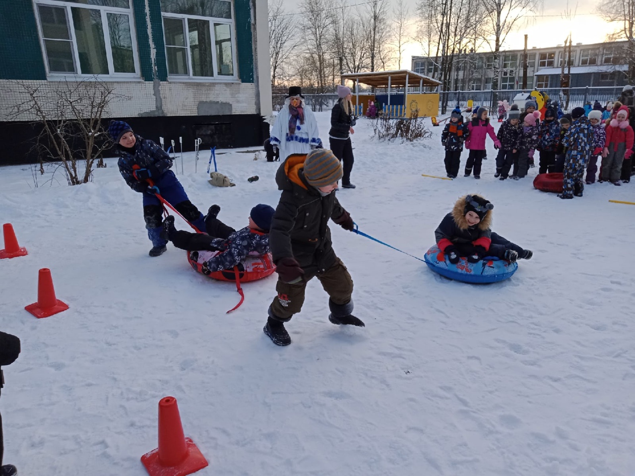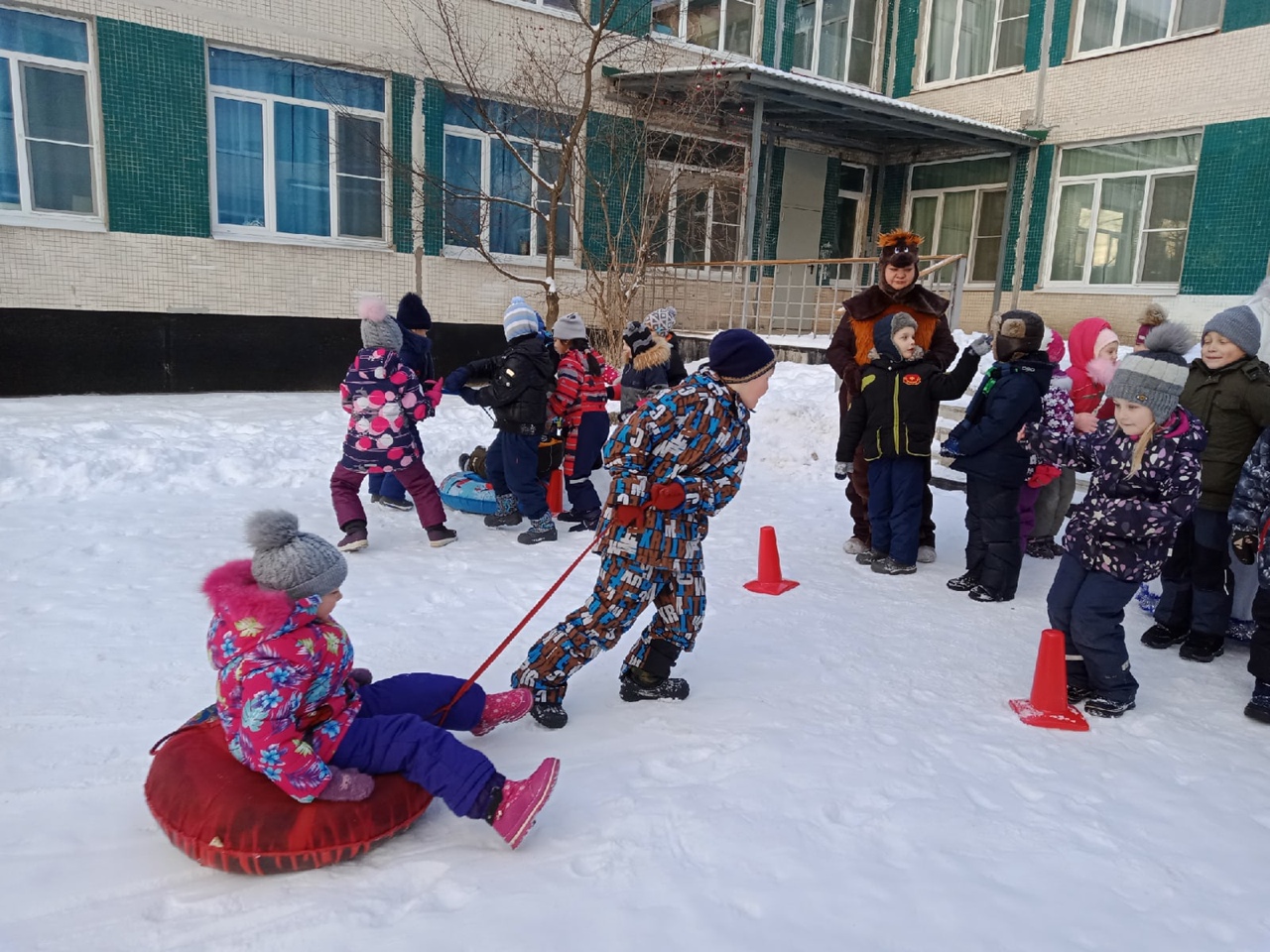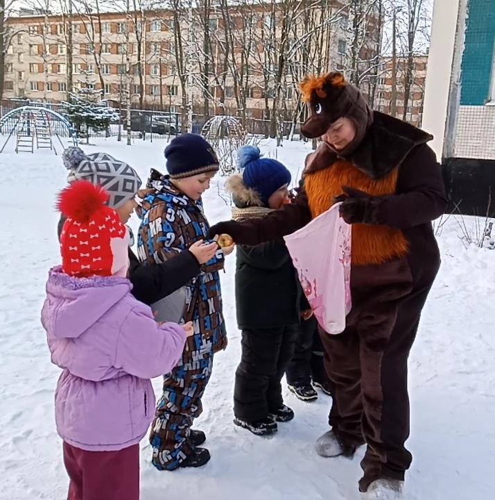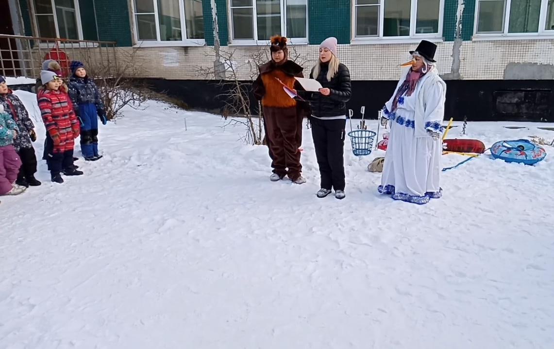 Главным персонажем праздника был Снеговик, которому дети очень обрадовались. Далее к ним присоединился Медведь, который проснулся от шумного праздника.